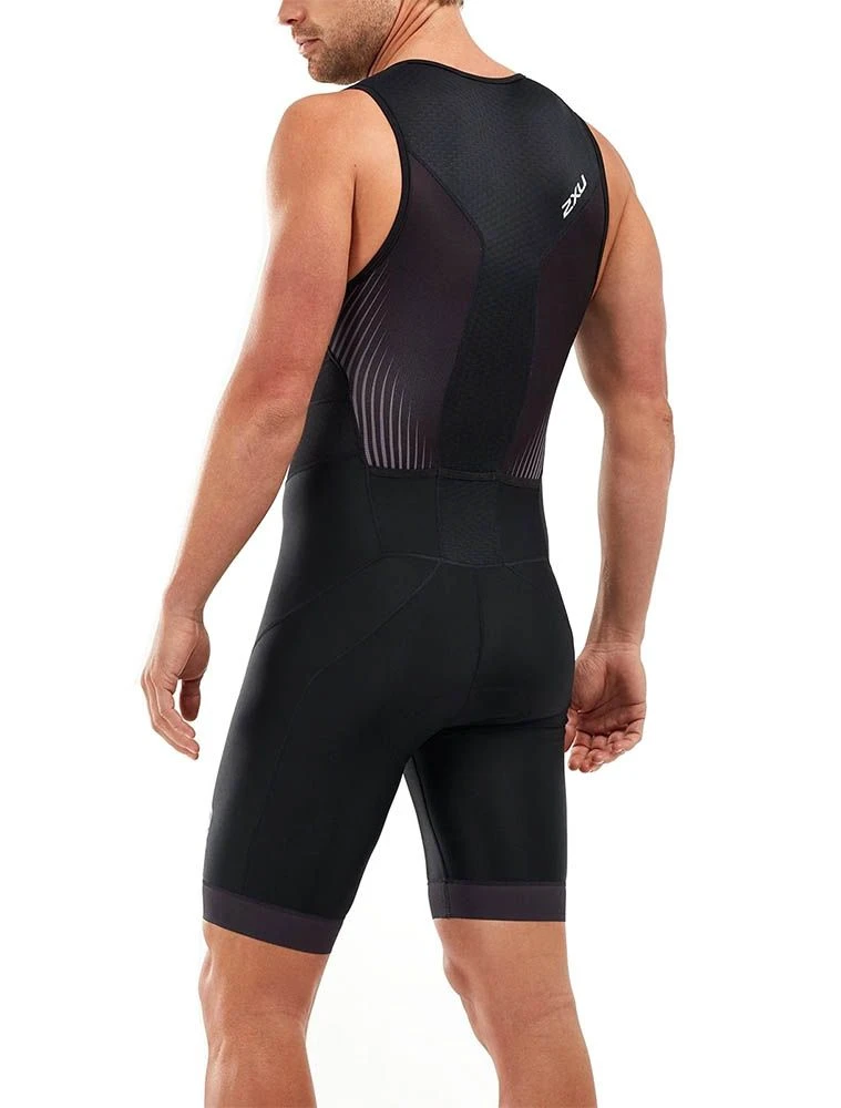 Re-engineered in accordance with RMIT University’s latest research, the 2XU Perform Front Zip Trisuit in Black and Shadow delivers the advanced cooling and ventilation technologies required to conquer the rigors of triathlon.
