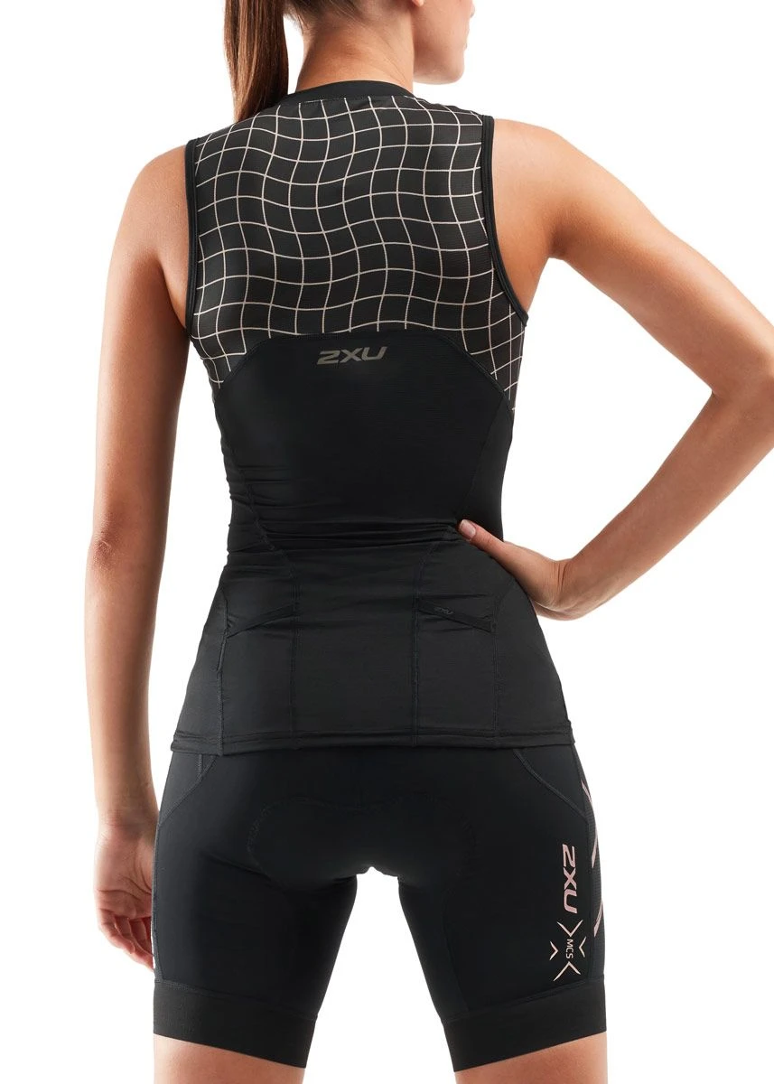 Completely redesigned in accordance with 2XU’s latest RMIT University research, the 2XU Women’s Compression Tri Singlet in black and gold promises superior ventilation and power.