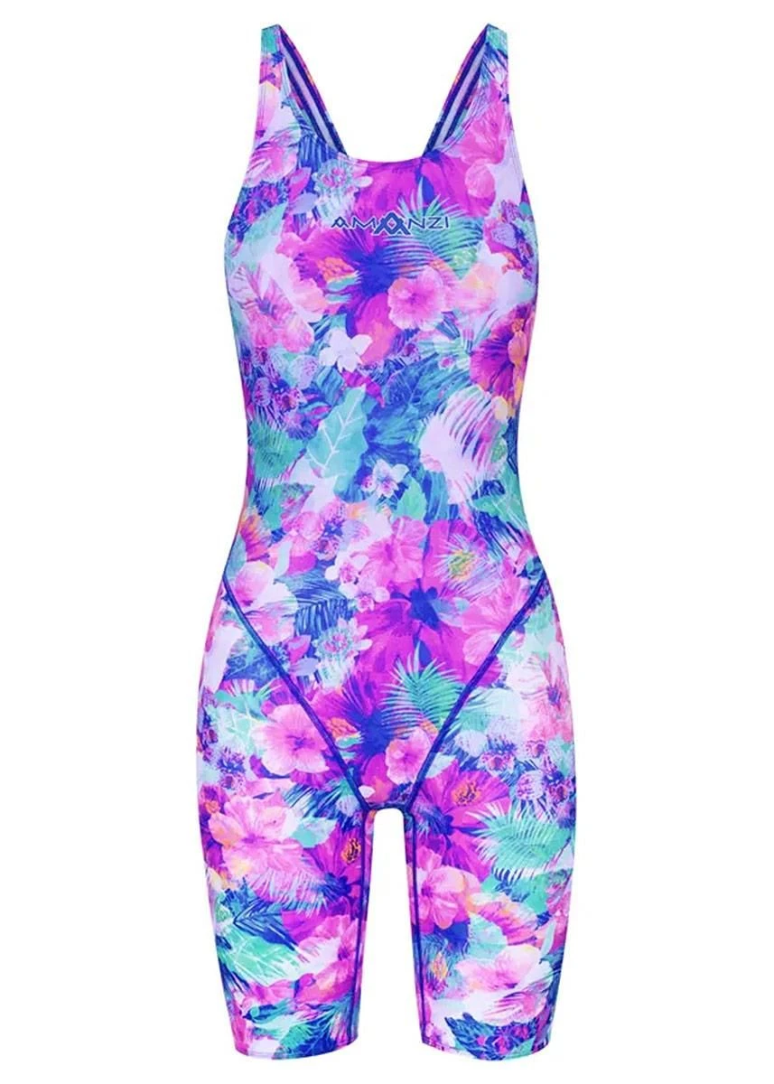 The Wild Blooms Kneelength swimsuit is an entry level racing swimsuit that is also suitable for training. The kneelength has been engineered to fit the needs of competitive and active swimmers, as well as triathletes and open water swimmers. The wide shoulder straps and back band are placed between the shoulder blades, allowing for maximum freedom and ease of movement whilst swimming. They also provide added bust support. The wide open back follows the natural contour of the body, providing an ergonomic fit and superior comfort.
