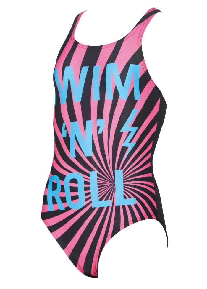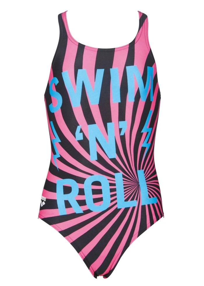 A great suit for regular training and leisure swimming sessions this Arena girls Swim n Roll swimsuit in black and pink has been printed with a fun and eye catching “Swim n Roll” Slogan that looks great in and out of the water.