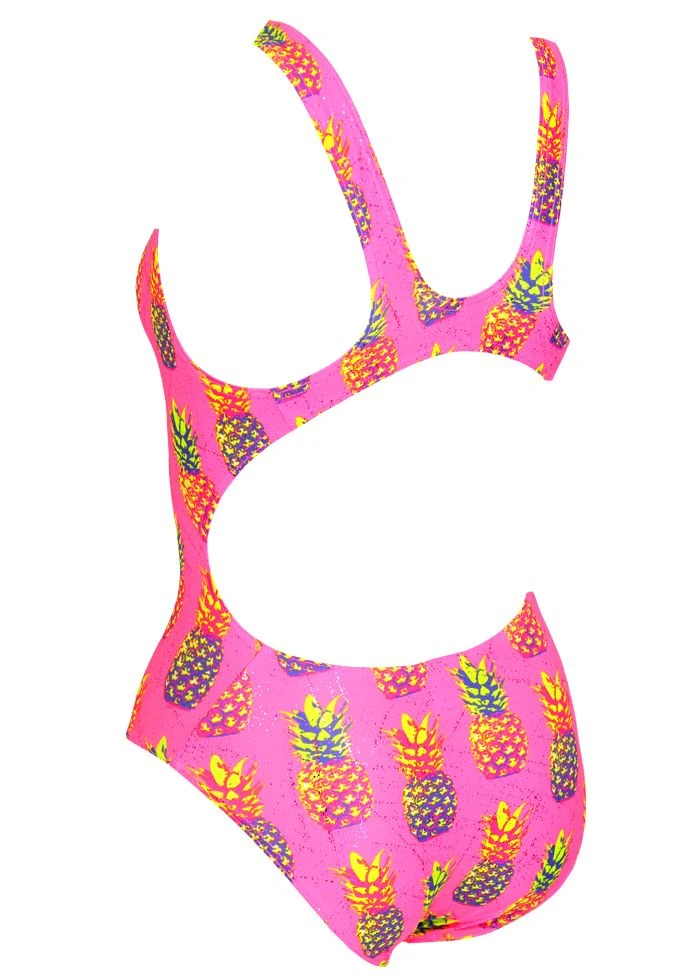 The Girls Pineapple Swimsuit from Maru Swimwear features a tropical pineapple print on a pink fabric and is ideal for swim training, fitness or leisure use!