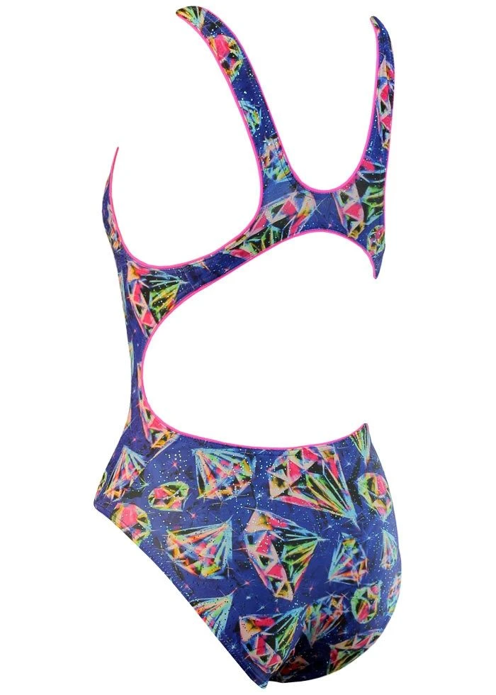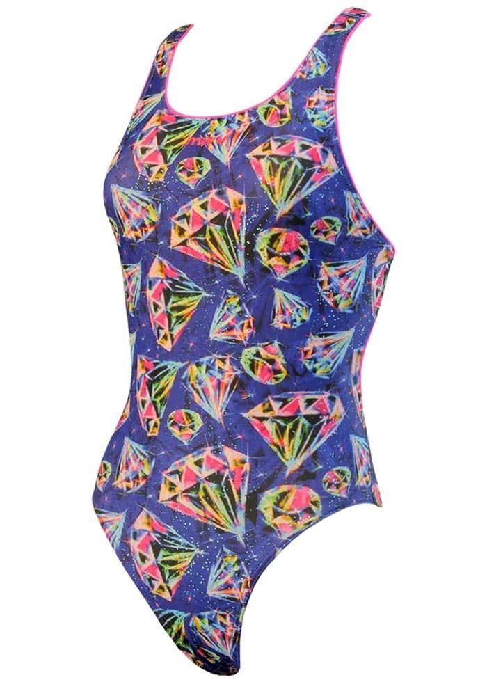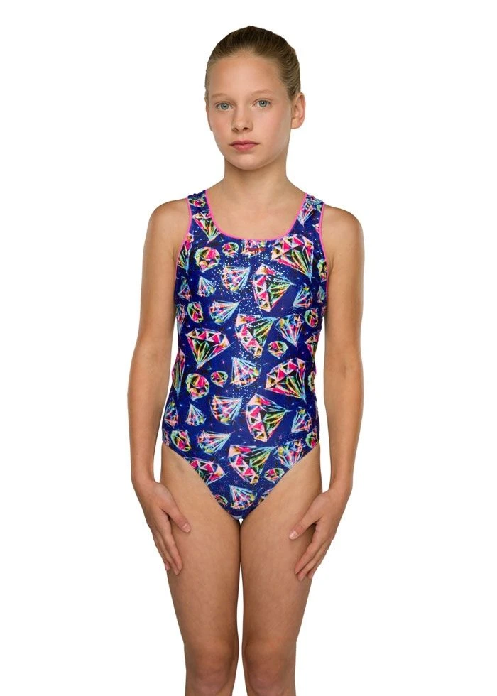 Your daughter will love the girl’s razzle dazzle swimsuit by Maru featuring a colourful diamond print that stands out against the midnight blue swimsuit.