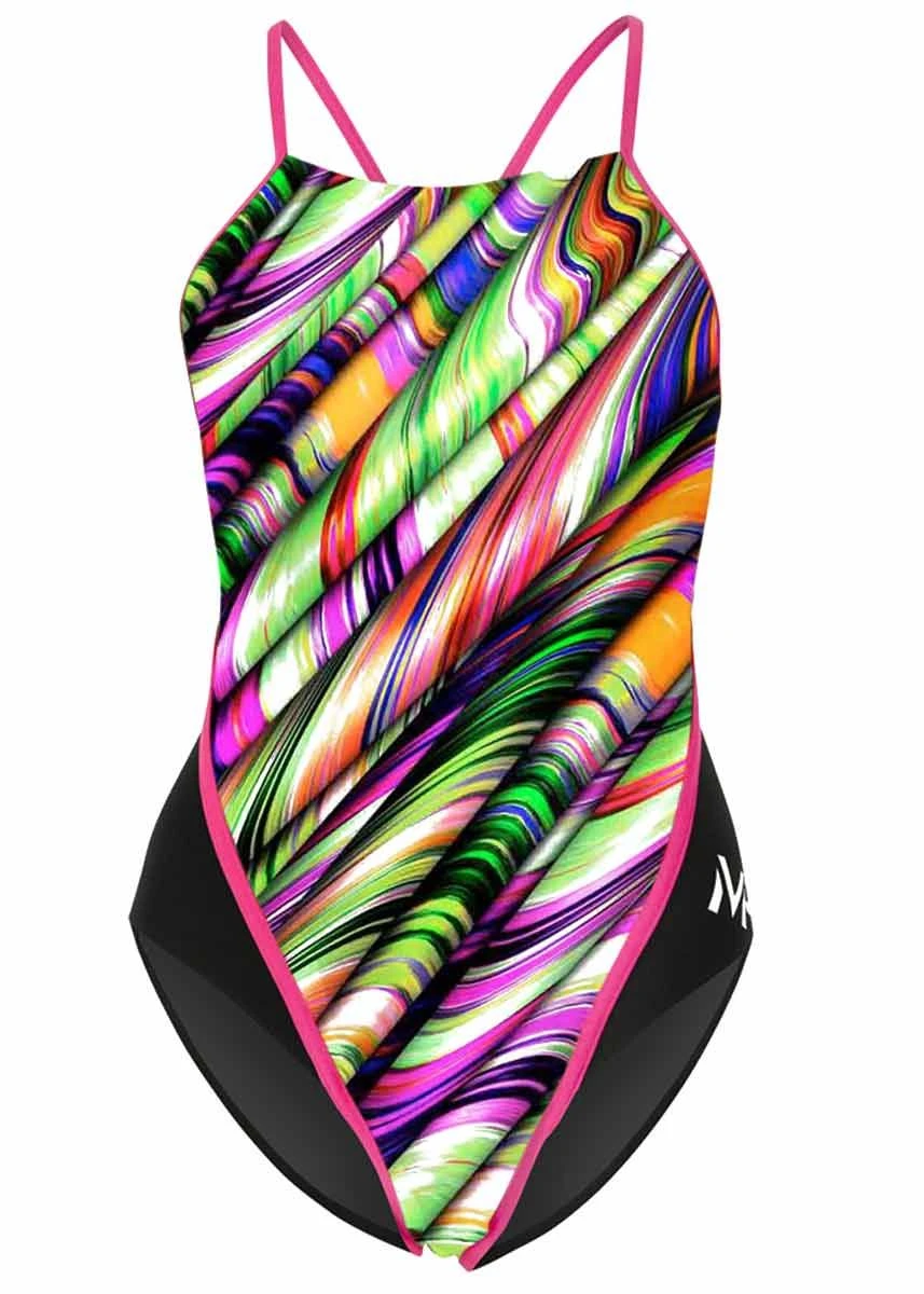 The bright and colourful design on this Girls Margareta Racerback Swimsuit consists of a rippling pattern print that is bold and beautiful.Â