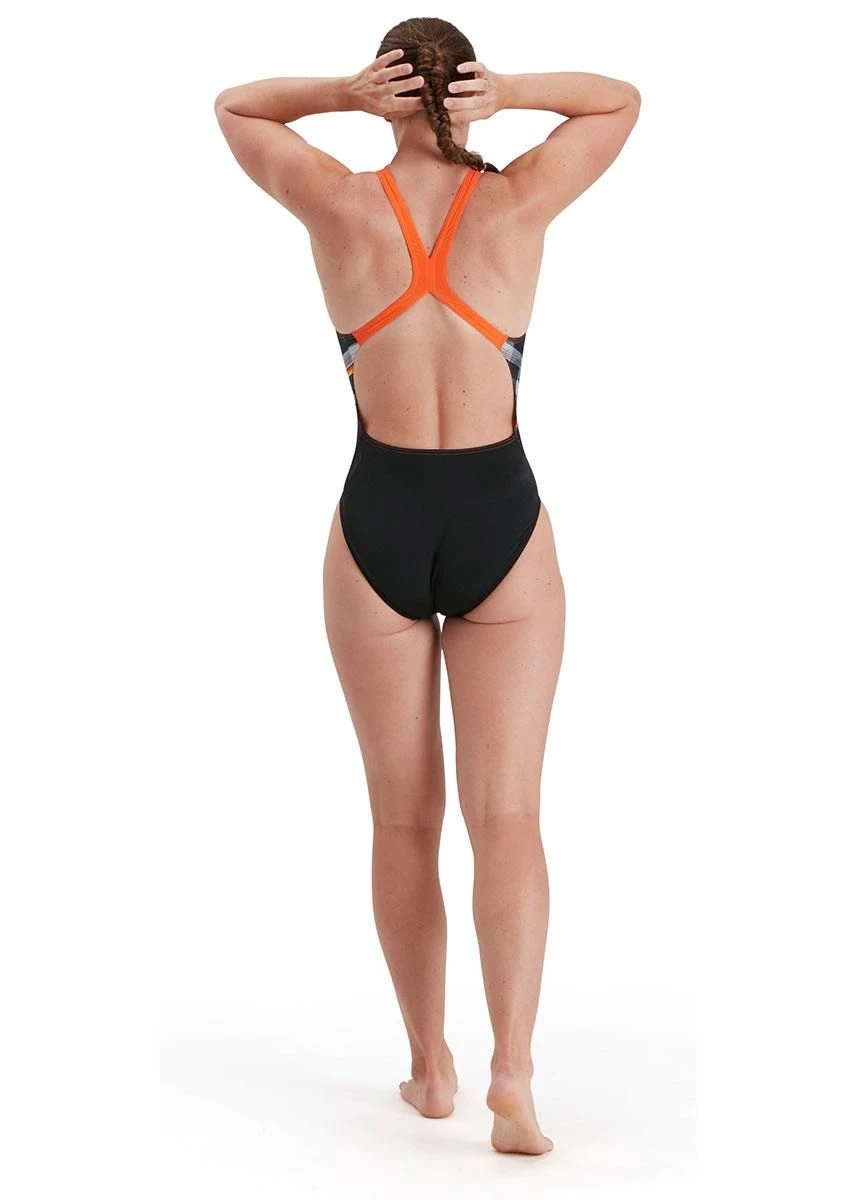 This Speedo Placement Digital Powerback swimsuit features a warped digital print with distorted, glitch-effect graphics and contrasting orange straps.